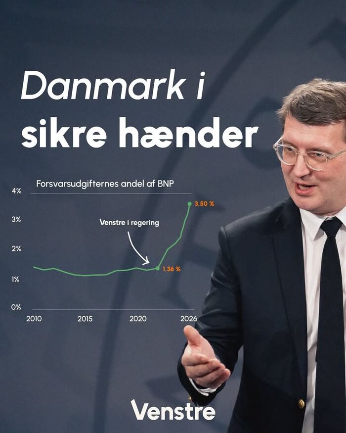 Danmark i sikre hænder 🤝🇩🇰 Venstre tager ansvar for Danmarks sikkerhed! I 2026 bruger vi 3,5 procent af BNP på Forsvaret. Det højeste niveau i årtier og et markant løft på få år. Samtidig står vi fast…